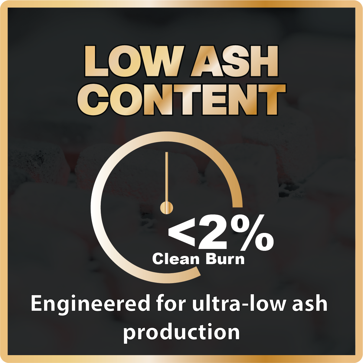 Low ash content ensures a cleaner smoking experience, as it reduces the buildup of residue in your hookah. Our briquettes have an ash content of 1.7-2.3% (<2%), minimizing cleanup while maintaining excellent heat.